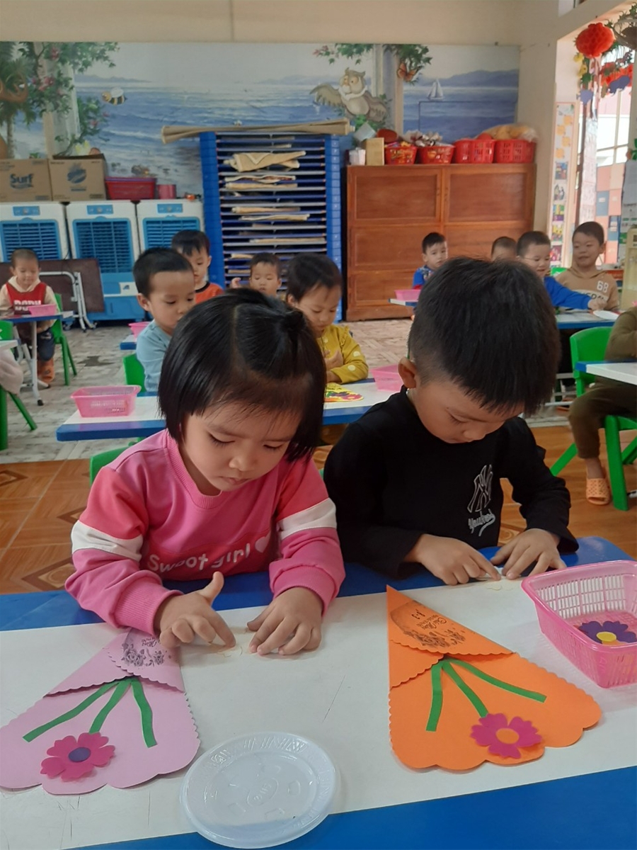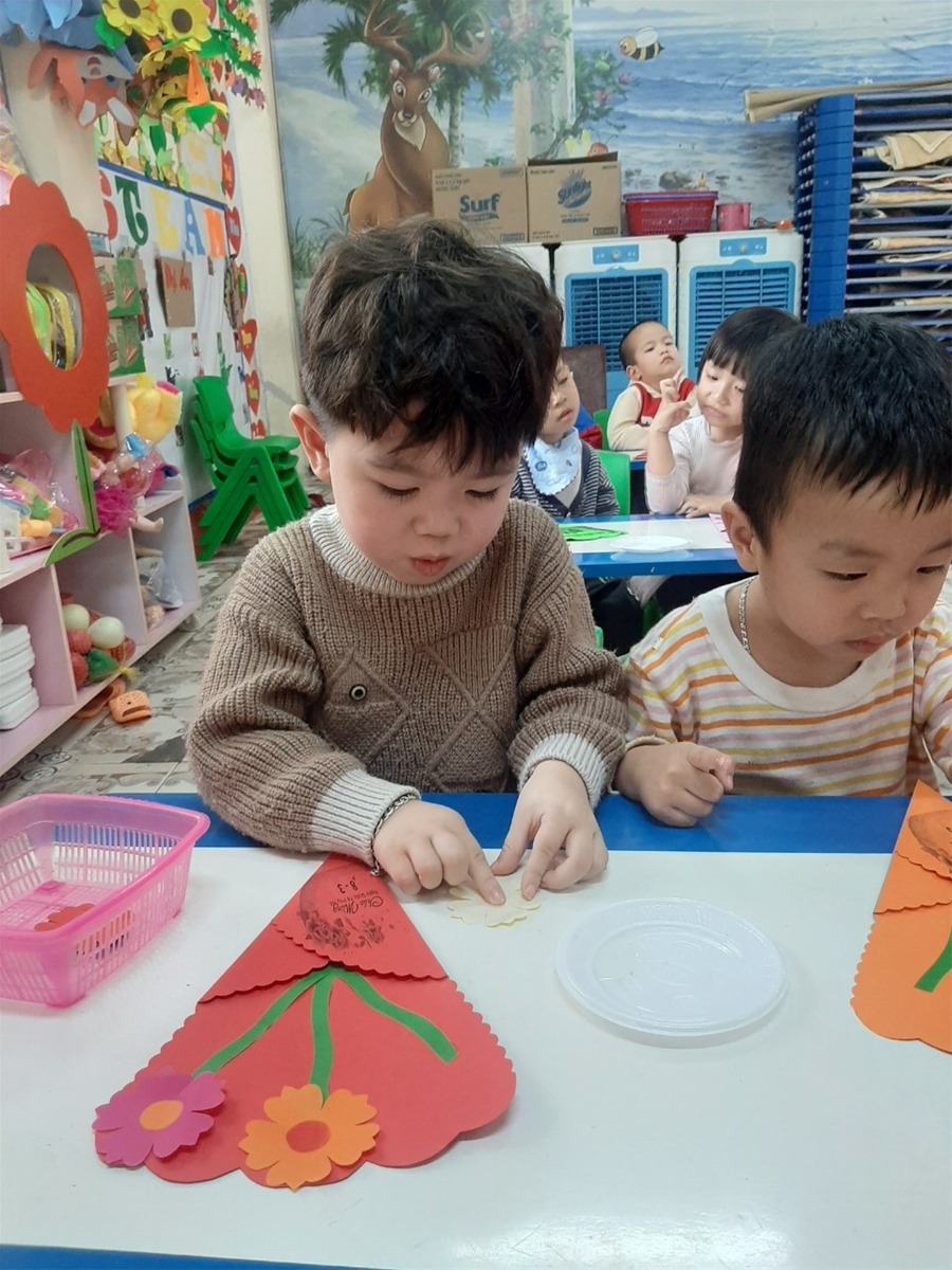 Với sự hướng dẫn của cô, các bé được tự tay dán và trang trí một tấm thiệp thật sinh động, gửi ngàn lời yêu thương dành cho bà và mẹ của mình. Chắc hẳn các bà, các mẹ của các bé sẽ cảm thấy rất vui khi nhận được món quà do chính tay các con tự làm ra.